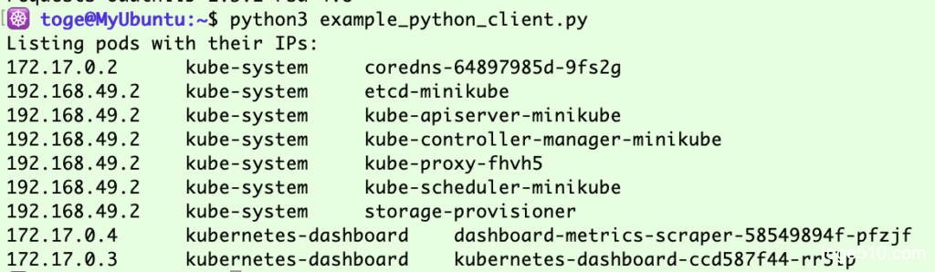 「Pythonクライアントは、kubectlと同じkube configファイルを使って、APIサーバーの特定と認証をすることができる」とのことです。curlにオプション付けて頑張ったのバカみたいですね。。