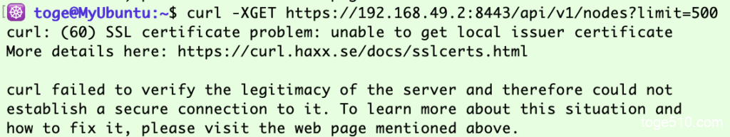 SSLのエラーが出ております。とりあえず、–insecureオプションで逃げてみましょう。