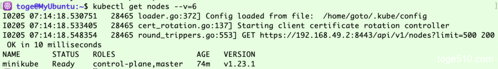 kubectl get nodes でノードの情報をとります。オプションで–v=6と指定すると、このコマンドが何をやっているのかが表示されるようです。